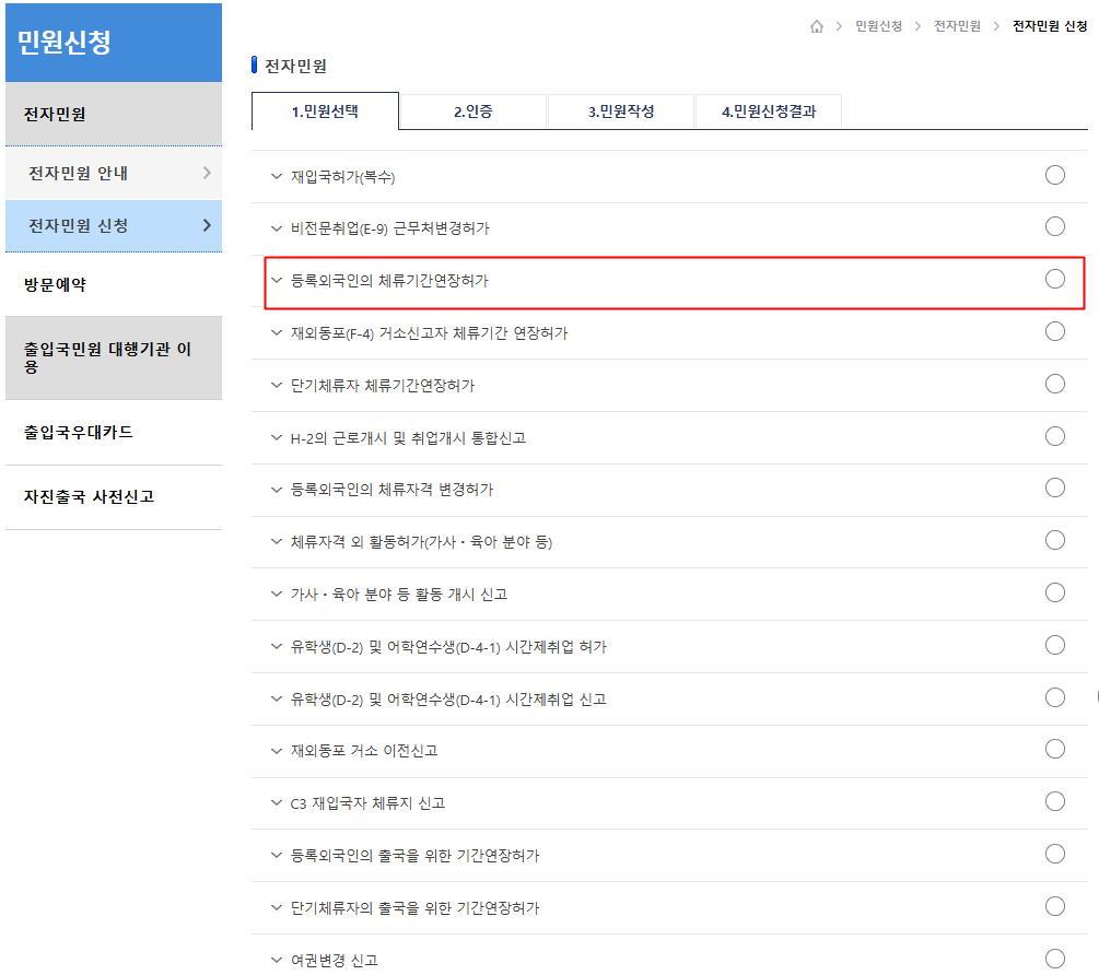 2. 민원신청 -> 등록외국인의 체류기간 연장허가