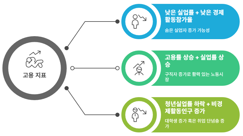 => 실업률, 고용률, 경제활동참가율 세 가지를 함께 분석해야 정확한 해석이 가능합니다.