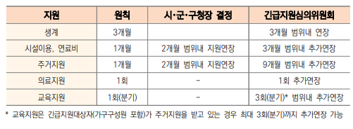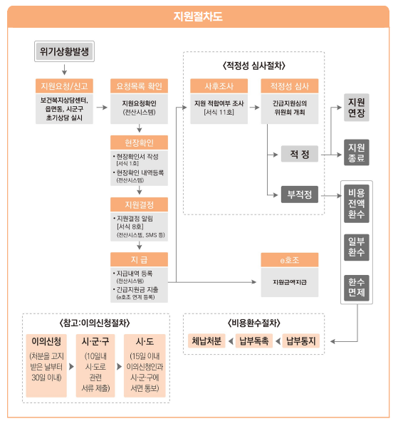 * 시, 군, 구청을 통해 접수하며, 위기사유에 따라 당일 또는 며칠 내 지원 결정