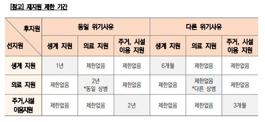- 지원이 종료되면 재지원 제한 기간에는 동일한 종류로 다시 지원할 수 없음