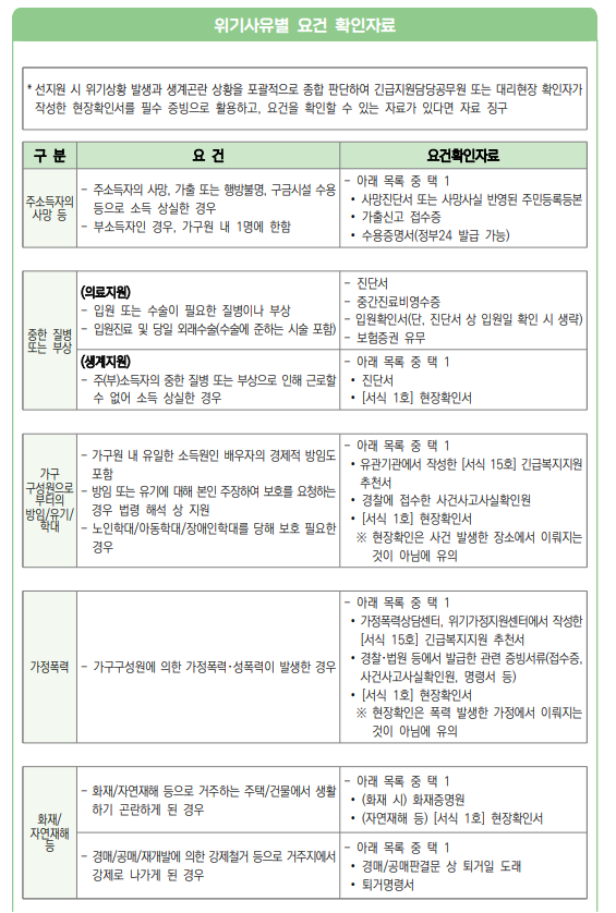 - 위기상황에 처한 사람이나 관계인이 지원 요청 또는 신고할 경우 현장확인을 통해 긴급지원의 필요성을 포괄적으로 판단해