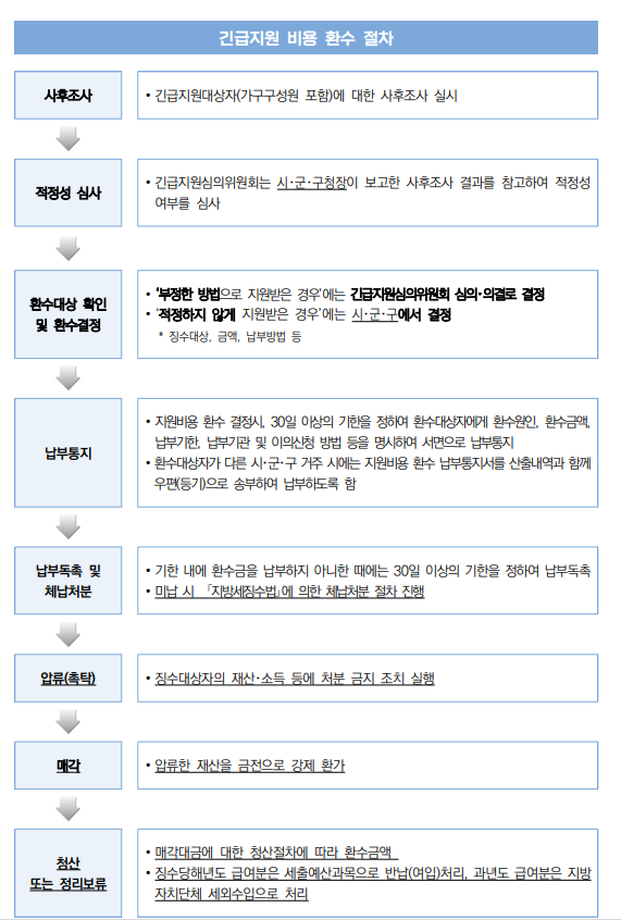 부득이하게 긴급 지원비가 환수될 경우에 아래의 절차대로 진행됩니다.