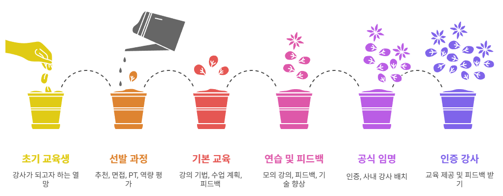 사내 강사 육성 프로그램은 기업 내 직원 중 전문성과 전달력을 갖춘 인재를 선발해 사내 교육 강사로 양성하는 체계적인 인재개발 제도입니다. 교육 대상은 신입사원, 직무 전문가, 관리자 등이며, 사내 교육 내재화, 조직문화 전파, 교육 비용 절감 등의 목적을 지닙니다.