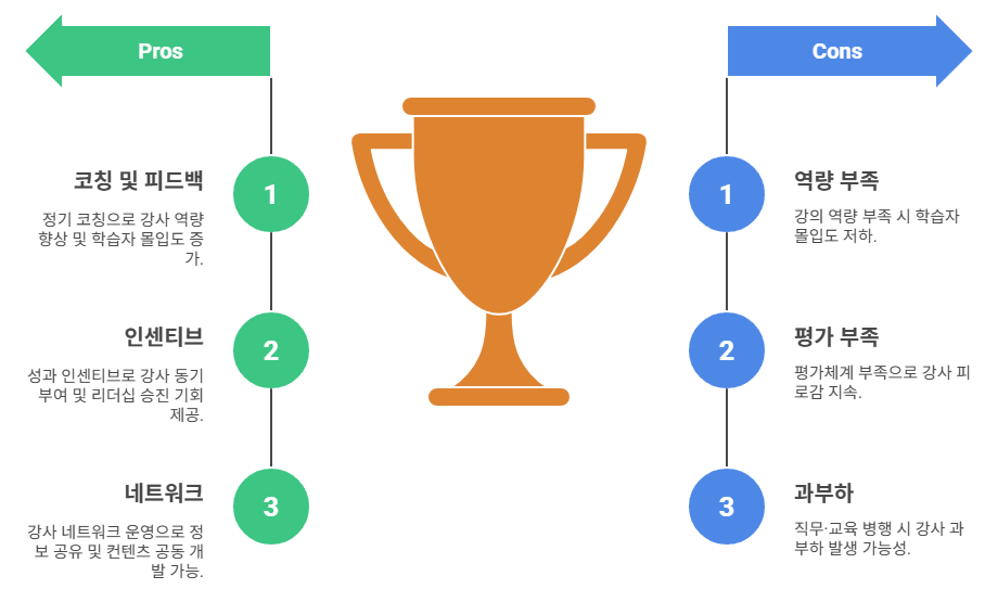 - 강사 간 정기 워크숍 및 모범강사 리더십 연수 제공