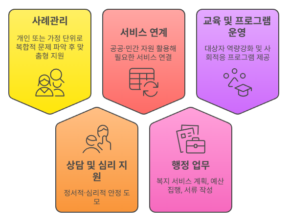 => 사례관리, 상담, 자원연계, 프로그램 운영 등 다양한 복지 지원 업무를 수행합니다.