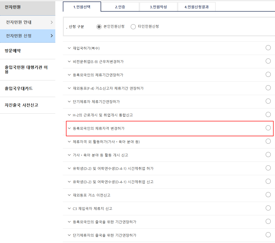 1. 변경허가 신청서(통합신청서-체류자격 변경허가 선택)