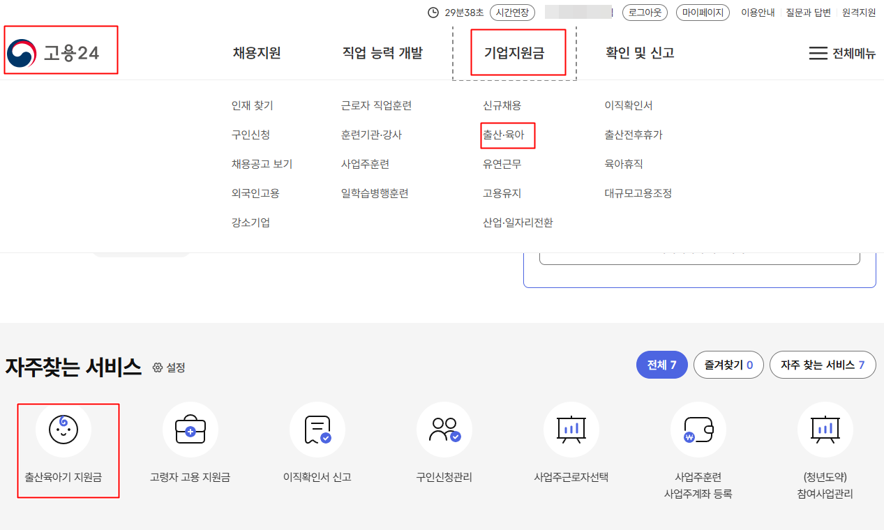 1. 고용 24 홈페이지 접속 또는 사업장 관할 고용센터 방문 -> 기업지원금 -> 출산, 육아