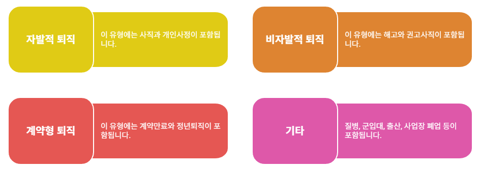 퇴직은 사유에 따라 회사의 책임이 달라지고, 근로자의 권리(퇴직금, 실업급여 등)에도 영향을 미칩니다.