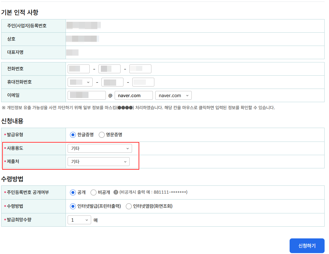 금융기관이나 관공서 등 여러 가지가 있으니 발급용도에 알맞게 선택해주시면 됩니다!