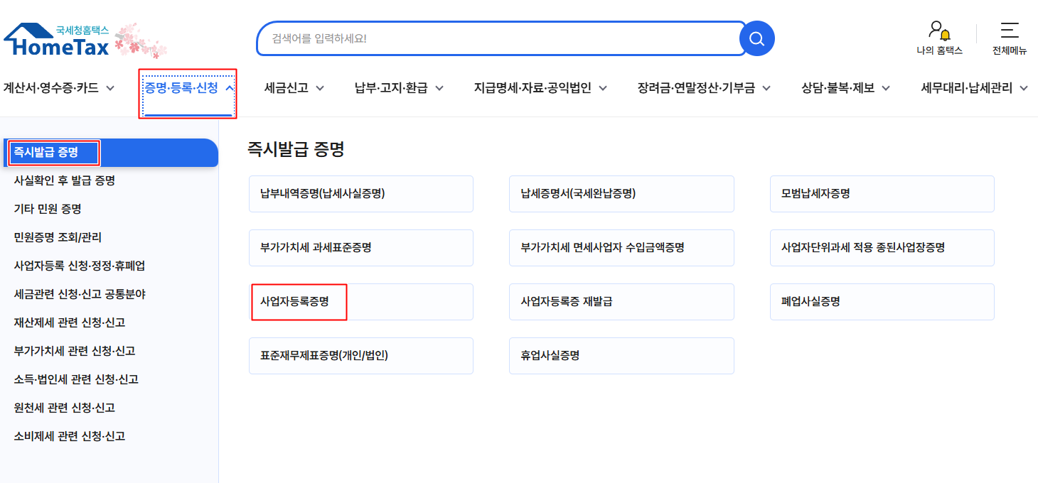 2. 증명/등록/신청 -> 즉시발급 증명 -> 사업자등록증명 선택