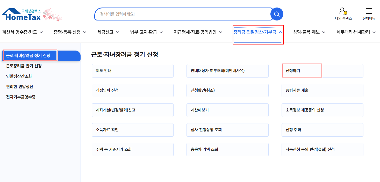 2. 장려금/연말정산/기부금 -> 근로, 자녀장려금 정기신청