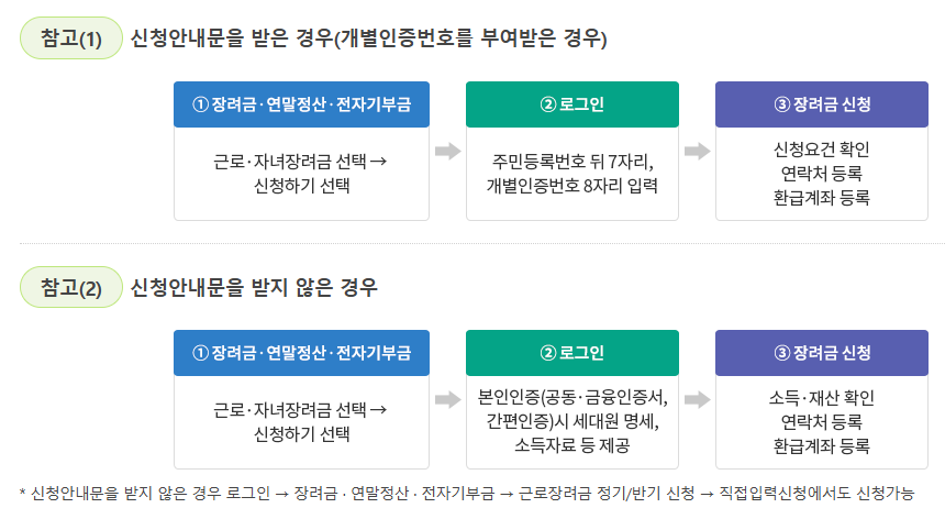 보통 신청 시기가 오면 장려금 신청에 해당되는 근로자에게는 별도로 개별인증번호가 부여됩니다.
