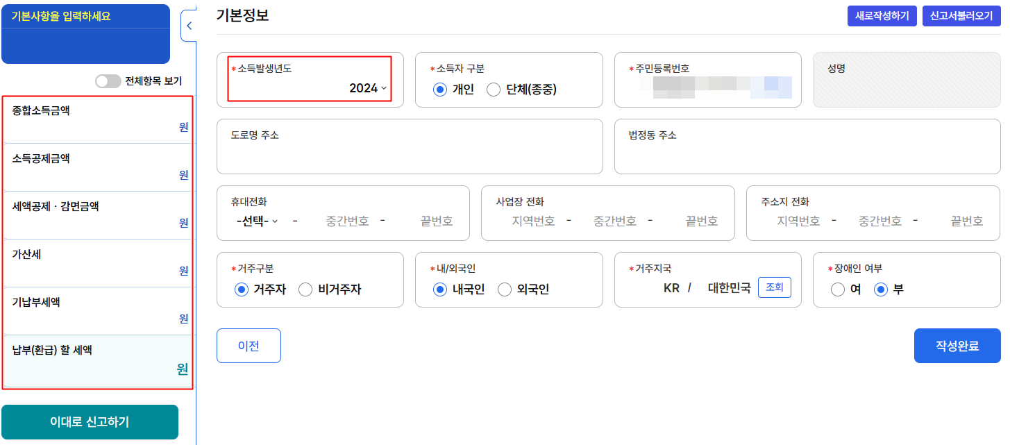 2. 기본정보 및 종합소득금액, 세액공제금액 등 입력