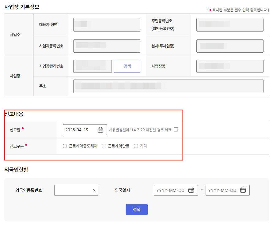 신고내용에서 신고일은 마지막 근로일 다음날로 선택해 주시면 됩니다!